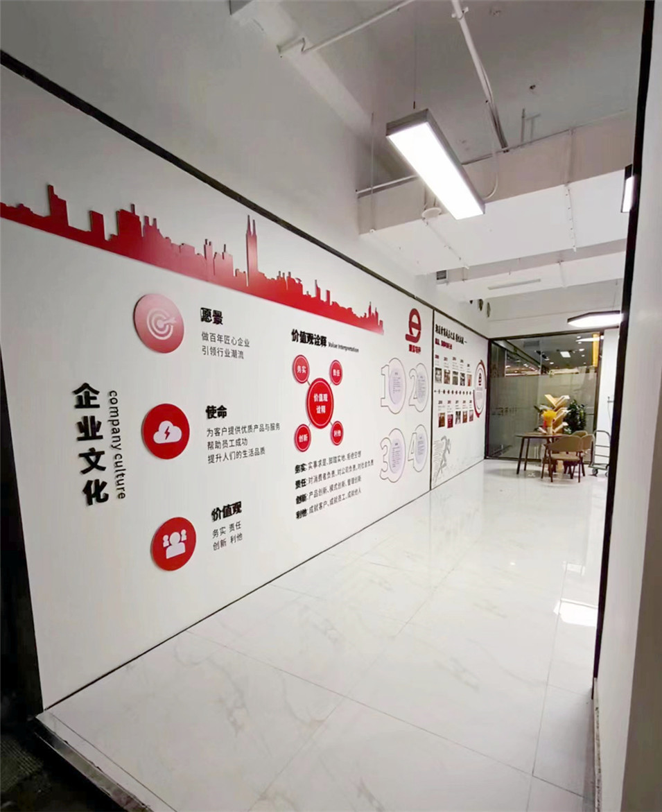 設(shè)計(jì)師在利用原有玻璃墻結(jié)構(gòu)的基礎(chǔ)上進(jìn)行設(shè)計(jì),充分利用了原有結(jié)構(gòu)基礎(chǔ),受力可靠,效果好又控制成本,選擇合適的材料,整體在原來的玻璃上貼生態(tài)石膏板批大白墻,因?yàn)槔习逑矚g無縫隙的施工工藝,不要一條條縫隙或收邊條,石膏板墻自重輕、批灰刷漆后又沒有縫隙,加上畫面需要細(xì)膩的城市剪影和人物形象體現(xiàn),我們做了一層油畫布的基層。再面貼凸出來的字符和圖形,材料使用的是PVC板+面貼亞克力材料,視覺效果立體感突出、醒目。讓駐留前臺區(qū)等候的客人,賞析下公司的發(fā)展歷程,文化墻價(jià)值觀,油畫布的肌理視覺和觸感都有高級感,加上文化墻熏陶,感同身受!所以玻璃上貼文化墻其實(shí)沒那么單一的選擇,也沒有您想的那么難施工,那么貴,只需你找到一家合適的深圳文化墻制作公司,為您全心全意服務(wù)即可。